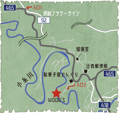 アクセスマップの入口1からWOOD'Sまでは5.6kmとなります。